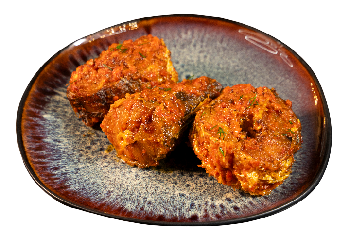Fried hake fish coated in spicy peppered sauce.