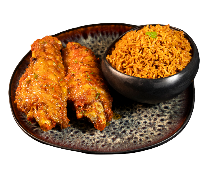 Juicy turkey pieces glazed in fiery pepper sauce, served with jollof or fried rice.